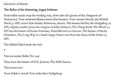Congratulations to both finalists! The winner will be announced later this year. Voters who included their email addresses should by now have all received their personalized chronicles. If you think yours has gone astray, go ahead and query.